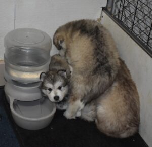 As newborns, they are raise on surfaces where they do not have to slip around and we keep rugs ( washable and slip resistant under them until they get at least 6 weeks old. We take the mom away from pups at about 6 weeks of age so that they get use to eating and not just nursing. We start feeding our pups mush at 2 weeks of age and the mom is wormed every other week and the pups ever other week starting at 3 weeks old on pups. I have 30 years of breeding experience. I have found over time we works best with my mom’s and pups. I sit with my mom’s when they or in labor and all the pups are handled daily.